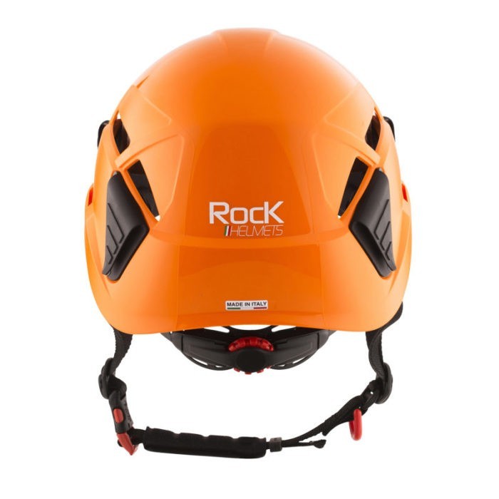 Kletterhelm mit kurzem Schild, Schnellverschluss am Kinnriemen, Einstellrad zur optimalen Größenanpassung an der Hinterseite und hervorragender Belüftung.